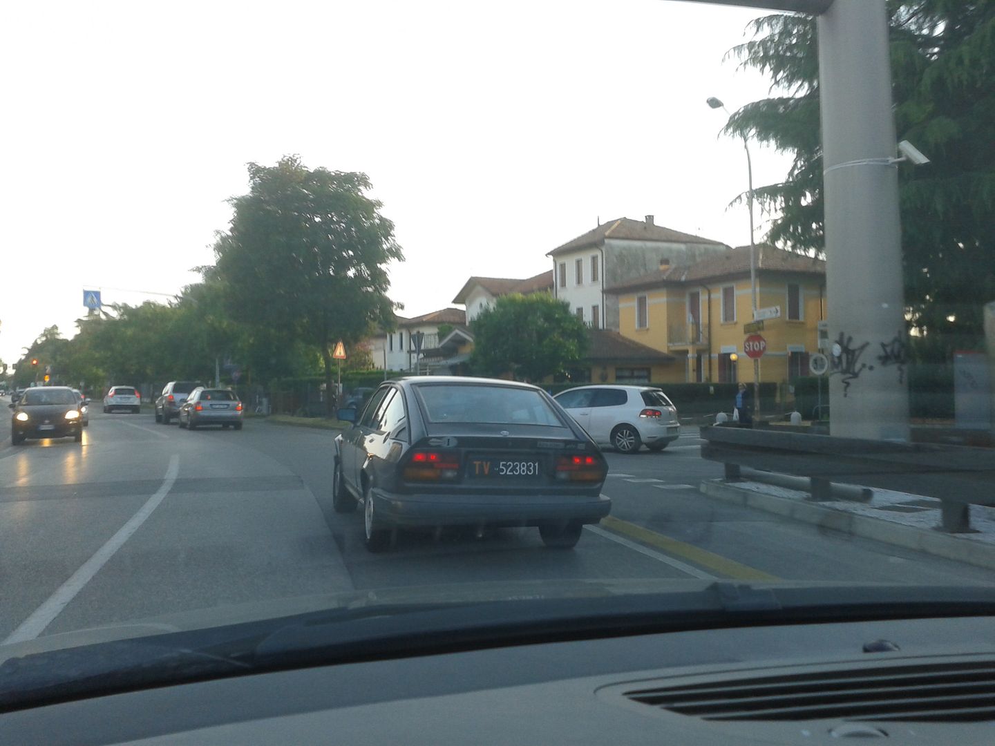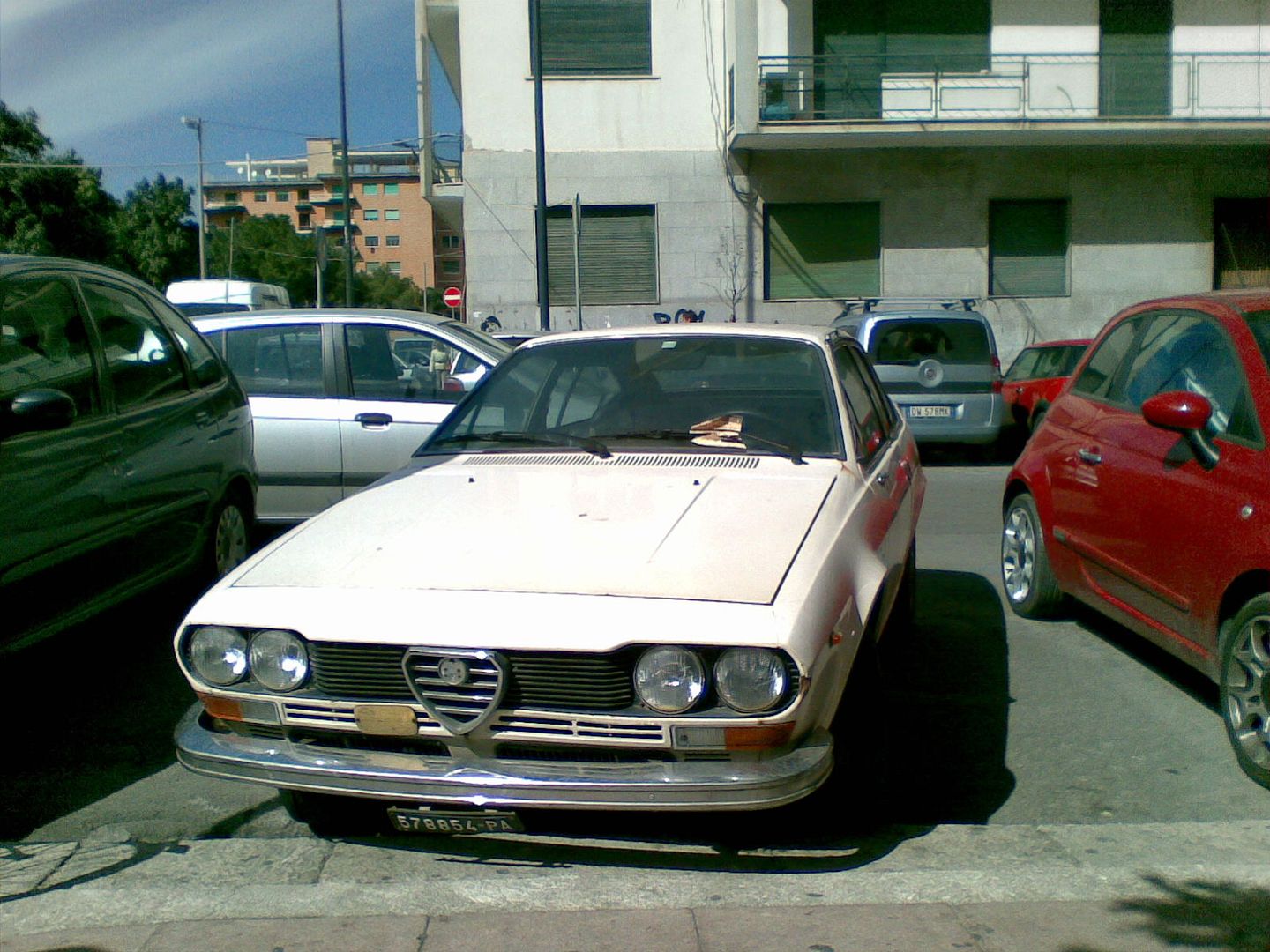 Stamattina alla disperata ricerca di un parcheggio in centro mi sono infilato in una stradina semi nascosta e becco subito un Alfetta Gt che starebbe bene in "sedotte e abbandonate" guardandola bene mi ricordo che l'avevo gia beccata in condizioni un pelo migliori qualche anno fa...poi il mio occhio è andato su quella 75 TS e mentre fotografo arriva il propietario..titolare dell'officina di cui si vede la porta..e scopro un altro malato ha un duetto ed è a caccia di una Giulia..mi fa vedere la 75..cacchio ha solo 39mila Km...apre il cofano e leggo un etichetta di tagliando del primo propietario anno 2001 dei venti mila km..morale chiacchiere etc sono arrivato in ritardo ad un appuntamento..ma con solito sorriso che prende noi tutti in questi casi..